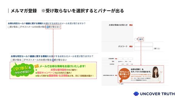 メールマガジンへの登録のボタンはもちろん置いてはいるものの、ここから登録を増やすためにどうすれば良いのか、自社のWebサイトを眺めているだけでは、なかなか考えが浮かばないこともあります。このような時は、同業他社を参考にします。下画像の例では、メールマガジンを「受け取らない」を選ぶとバナーが出ます。