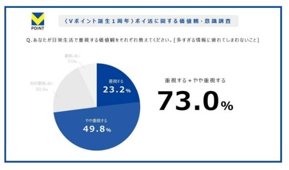 日常生活で重視する価値観について、「多すぎる情報に疲れてしまわないこと」を「やや重視する」(49.8%)、「重視する」(23.2%)と回答した人は 73.0%に上った。
