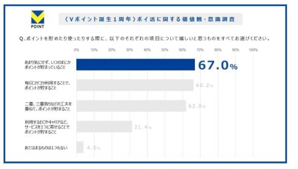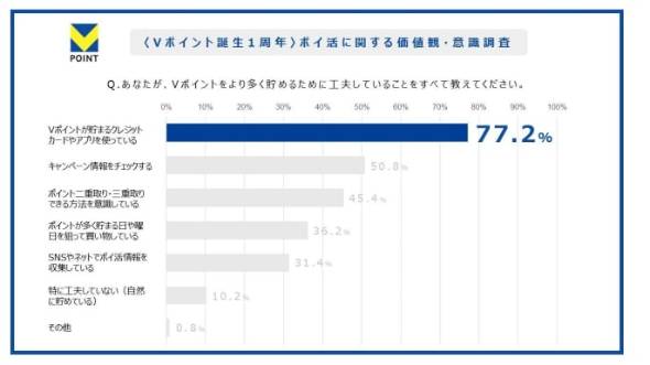 「Vポイントをためるために行っている工夫」については、「Vポイントがたまるクレジットカードやアプリを使っている」(77.2%)が最も多かった。生活導線の中で自然にポイントがたまる仕組みを活用し、無理なくポイ活をしているユーザーの様子がうかがえる。