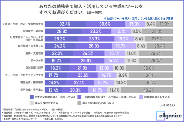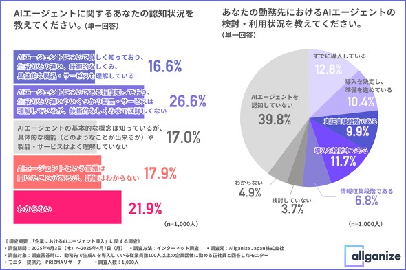 生成AIソリューションを手掛けるAllganize Japan(東京都渋谷区)は、生成AIを導入している従業員規模100人以上の企業に勤める正社員および経営層(役員クラス)1000人を対象に「企業におけるAIエージェント導入」に関する調査を実施した。