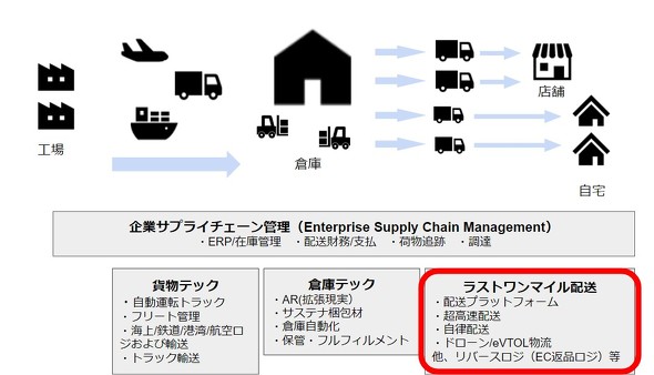 この利便性を支えるのが、高度に発達した物流網であり、中でも最寄りの物流拠点から受取人への配送を意味する「ラストワンマイル配送」は、ビジネスの進化が著しい。サプライチェーン全体の中で、ラストワンマイル配送は最終消費者である個人宅へのローカルデリバリーを手掛ける部分に該当する。