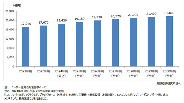 調査は2024年12月〜2025年3月、矢野経済研究所の専門研究員による直接面談(オンライン含む)、電話・アンケートによる調査、文献調査にて実施。調査対象はITベンダー・SIer、機器・装置メーカー/機器・装置メーカー系の情報システム事業者、アプリケーションベンダーなど。