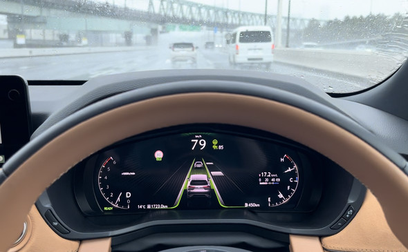 激しい雨が降りしきる中の走行では、およそ100キロ走行ごとに「ミリ波レーダーの前部カバーが汚れました」という表示とともにACCが強制的にキャンセルされた。通常走行は可能だが、その都度サービスエリアやパーキングエリアに入って、エンジンを停止し、システムを再起動させた。