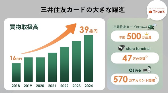 三井住友カードの取扱高は2018年の16兆円から2024年には39兆円へと2.4倍に拡大。また、三井住友カード(含Olive)は年間500万人の新規会員を獲得し、決済端末steraは47万台を突破、Olive自体も570万アカウントを達成。特に買物取扱高の伸びは、決済データの蓄積につながり、今回のソフトバンクとの提携によるデータビジネスの基盤となっているこの動きは、銀行・決済サービスとIT企業の連携という国内の大きな潮流の一環でもある。昨年来、みずほフィナンシャルグループと楽天グループも連携を進め、みずほ銀行はGoogleとも戦略提携を結んでいる。楽天は金融とEC、通信を一体化した経済圏を構築し、NTTドコモはd払いを軸に決済からポイント、ヘルスケアまで幅広いサービスを展開している。
