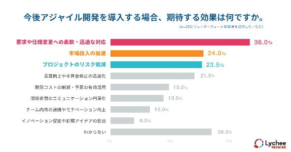 今後アジャイル開発を導入する場合に期待する効果については、「要求や仕様変更への柔軟・迅速な対応」(36.0%)が最も多く、「市場投入の加速」(24.0%)、「プロジェクトのリスク低減」(23.5%)と続いた。