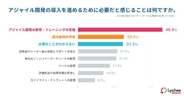 アジャイル開発の導入を進めるために必要だと感じることについては、「アジャイル開発の教育・トレーニングの実施」(46.0%)が、2位「成功事例の共有」(25.0%)との差を大きく広げ1位となった。
