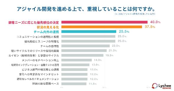 アジャイル開発を進める上で重視していることについては、「顧客ニーズに応じた優先順位の決定」(40.0%)が最多となり、「状況の見える化」(37.5%)、「チーム内外の連携」(25.5%)が続いた。