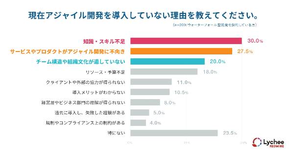 また、アジャイル開発を導入しない理由については、「知識・スキル不足」(30.0%)が最も多く、次いで「サービスやプロダクトがアジャイル開発に不向き」(27.5%)、「チーム構造や組織文化が適していない」(20.0%)となった。