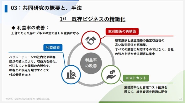 「既存ビジネスの精緻化」は、徹底したコスト管理や利益率の改善、取引先の再構築などにより、既存ビジネスの利益率の改善に取り組むケースだ。船井総合研究所の真貝大介社長は「儲からない客をカットしている」と説明した。