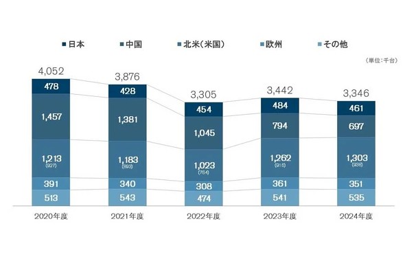 日産の2024年度グローバル販売台数は334万6000台で、前年から約2.8%減少した。地域別のシェアを見ると、日本が10.7%と最も高い。続いて中国が3.2%、米国が5.8%、欧州が2.2%である。