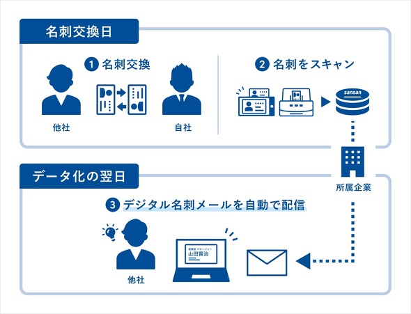 デジタル名刺メールは、受け取った名刺をスキャンし、Sansanがデータ化した翌日に、相手のメールアドレス宛に自分のデジタル名刺を自動で送信する。