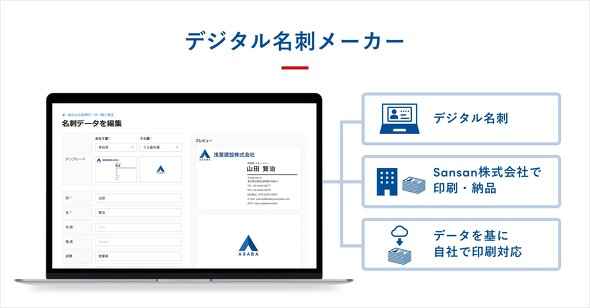 新サービスには、受け取った紙の名刺をSansanに登録するだけで、相手にデジタル名刺が自動送付される「デジタル名刺メール」と、紙とデジタル両方の名刺を作成・管理できる「デジタル名刺メーカー」を搭載する。