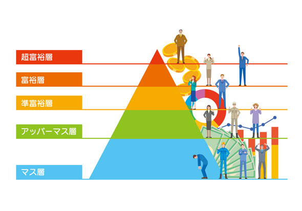 「超富裕層」は5億円以上、「富裕層」は1億円以上5億円未満、「準富裕層」は5000万円以上1億円未満、「アッパーマス層」は3000万円以上5000万円未満、「マス層」は3000万円未満――と定義している。