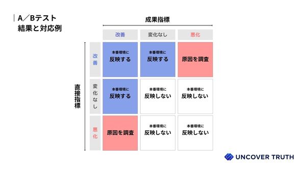 A/Bテストの結果を直接指標と成果指標で見ていく場合、下記の表のいずれかに当てはまります。下記は例ですが、それぞれの結果が出たときに、どのように判断するのかを事前に決めておきましょう。