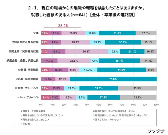 就職した経験のある人のうち、「離職して就職活動中」「離職を検討していて転職活動をしている」と回答した人は17.8%だった。「活動はしていないが意向がある人」を加えると40%弱の高卒社会人に転職ニーズがあることが分かった。
