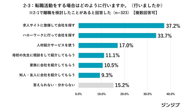 転職活動のやり方については、「求人サイトに登録する」(37.2%)が最も多く、「ハローワークに行って仕事を探す」(33.7%)が続いた。3番目の「人材紹介サービス」(17.0%)は上位2つと大きく差が開いた。