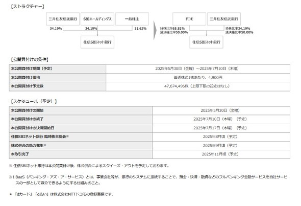 NTTドコモは5月30日から7月10日まで、住信SBIネット銀行の株式公開買付け(TOB)を実施する。約2336億円を投じドコモが発行済み株式の65.81%を取得し、同行を連結子会社化する。三井住友信託銀行は34.19%を保有し続け、議決権は両社が50%ずつ持つ形となる。