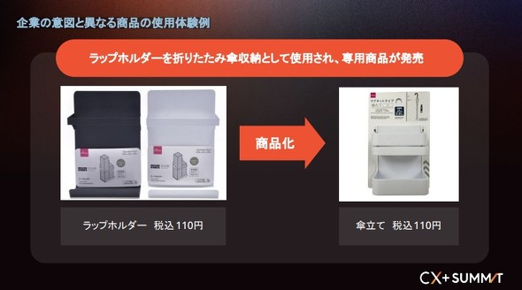 この考え方を裏付けるように、DAISOでは顧客の想定外の活用法からヒット商品が生まれるケースが数多く見られた。園芸用の「加圧式霧吹き」が窓サッシの掃除に活用されたり、子ども用玩具の「ミニ洗濯機」が大人の化粧道具洗浄用に人気を博したり、「ラップホルダー」が折り畳み傘の収納に使われたり──。これらは、企業側の初期の想定を超えた顧客の「ホンネ」の利用シーンであり、新たな商品開発や訴求改善の貴重な種となっていった。
