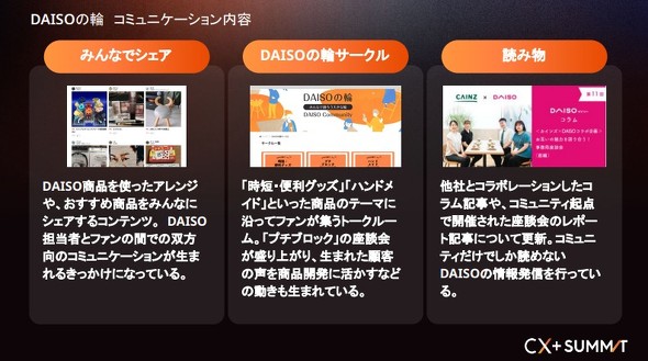 こうした背景から作られた「DAISOの輪」では、ユーザーがDAISO商品を使ったアイデアやおすすめ商品を共有する「みんなでシェア」や、特定のテーマでファン同士が語り合う「DAISOの輪サークル」、コミュニティ限定のコラム記事など、多様なコンテンツが展開されている。