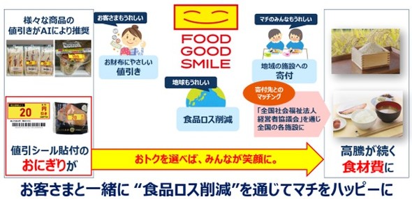 ローソンは6月3日、値引きシールを貼ったおにぎりを購入すると、1個につき1円を福祉施設に寄付する食品ロス削減プログラム「FOOD GOOD SMILE」を実施すると発表した。