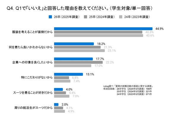 夏もリクルートスーツでの就活を希望した学生にその理由を聞いたところ、「服装を考えることが面倒だから」が最も多く、44.9%だった。