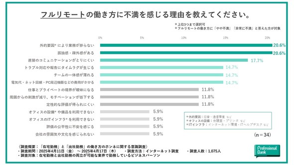 一方、フルリモート勤務に不満を持っている理由は「騒音や通信環境などの外的要因により業務が捗らない」(20.6%)、「孤独感・疎外感がある」(20.6%)などがあった。