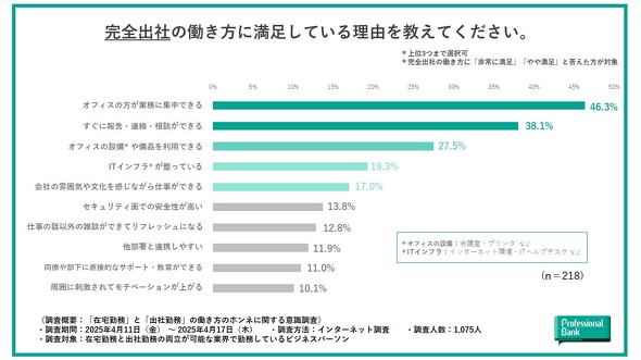 完全出社に満足している理由は、「オフィスの方が業務に集中できる」(46.3%)、「すぐに報告・連絡・相談ができる」(38.1%)が多かった。「オフィスの設備や備品を利用できる」(27.5%)、「ITインフラが整っている」(19.3%)、「会社の雰囲気や文化を感じながら仕事ができる」(17.0%)が続いた。