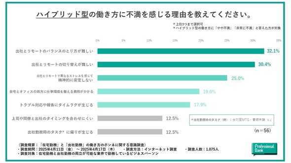 ハイブリッド型勤務に不満がある理由は、「出社とリモートのバランスのとり方が難しい」(32.1%)、「出社とリモートの切り替えが難しい」(30.4%)などがあった。