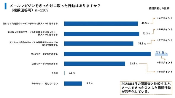 「メールマガジンをきっかけに取った行動はあるか」という質問に対しては、「Webでクーポンを利用する」(47.6%)や「気になった商品やサービスをWebで購入・申し込みする」(40.5%)が上位に。ライトアップとユミルリンクが1年前に実施した同様の調査と比べ、メールをきっかけとした購買行動が活発化していることが分かった。