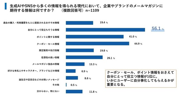 「企業やブランドのメールマガジンに期待する情報」は「自分にとって役立ちそうな情報」(56.1%)が最も多かった。「クーポン・セール情報」(44.9%)、「ポイントに関する情報」(41.0%)が続いた。