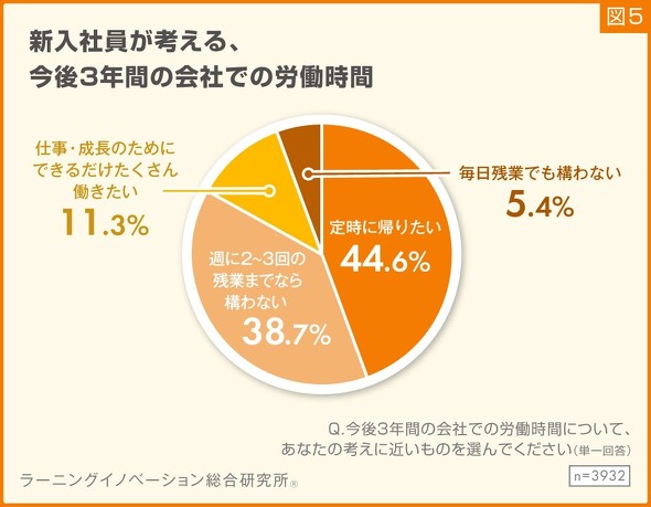 今後3年間の会社での労働時間について、「定時に帰りたい」と回答した割合が最も多く、44.6%に達した。「週に2〜3回の残業までなら構わない」(38.7%)、「仕事・成長のためにできるだけたくさん働きたい」(11.3%)、「毎日残業でも構わない」(5.4%)が続いた。