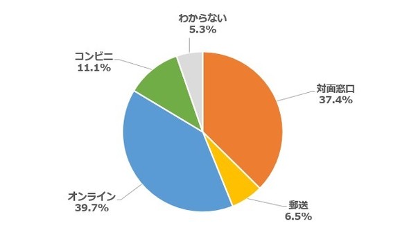 「市区町村の役所・役場で行う手続きで、どのような方法を選ぶか」という質問に対し「オンライン」(39.7%)が最も多く、「対面窓口」(37.4%)、「コンビニ」(11.1%)が続いた。