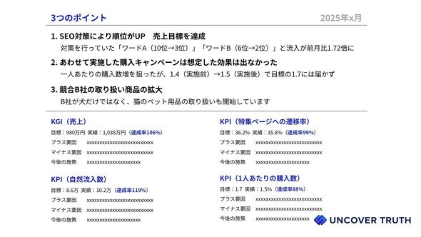 作成するには、データを出すチームと施策を実行するチームの双方の協力が必要ですが、用意できるとWebサイトに関わる全員が見てくれる運用レポートになります。