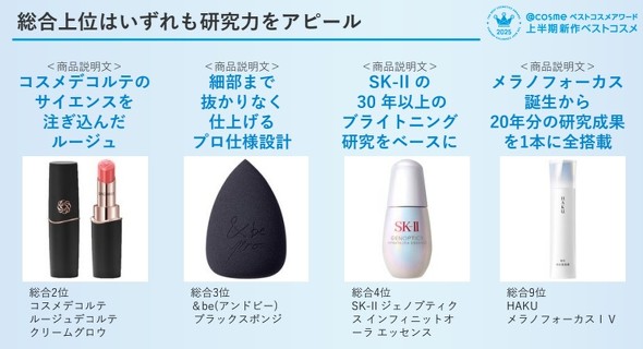シャンプー・トリートメントが総合大賞を受賞するのは、@cosmeベストコスメ史上初。「花王100年の研究で導き出した、ヘアケアの答え」というキャッチコピーで「研究力」をアピールした。この傾向は、同部門4位の「SK-II ジェノプティクス インフィニットオーラ エッセンス」や9位の「HAKU メラノフォーカスⅠⅤ」でも、長年の研究成果を前面に打ち出している点でも共通している。