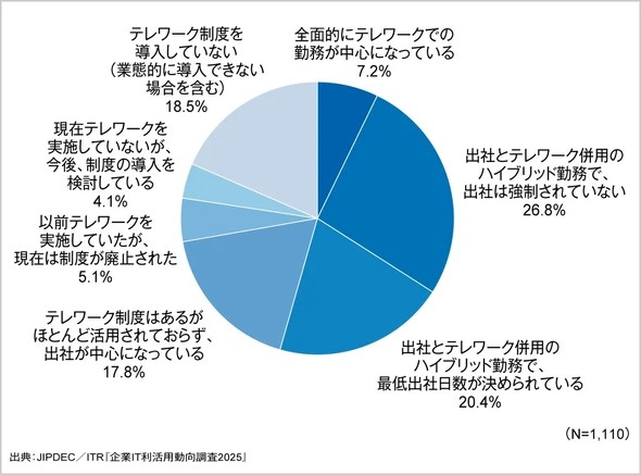 「全面的にテレワークでの勤務が中心になっている」企業は7.2%。Pマークを運営する日本情報経済社会推進協会と、IT調査会社のアイ・ティ・アール(東京都新宿区)が共同で実施した「企業IT利活用動向調査2025」で分かった。