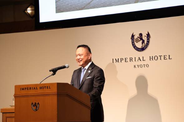 帝国ホテル 京都のターゲットについて、「インバウンド比率は、帝国ホテル 東京と同等の邦人4割、外国人6割を目指したい」と風間社長。「外資系ホテルと比較すると邦人の割合がかなり多いと思うが、外国人だけに寄せていく販売構成はできれば避けたい」と言及した。