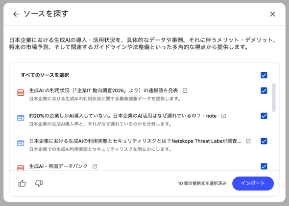 こういったユースケースの場合、そもそもソースになり得る情報が手元に揃(そろ)っていないことも多いだろう。そういった場合に便利なのが、Webで情報を検索してそのままソースとして追加できる「ソースを探す」機能だ。