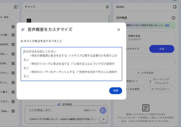 ソースが揃ったら、右上の「音声概要」カラムの「生成」をクリック。その際に「カスタマイズ」から指示を加えることで、内容を調整することも可能だ。音声の生成までに数分かかるので、時間があるときに操作しておくとよい。