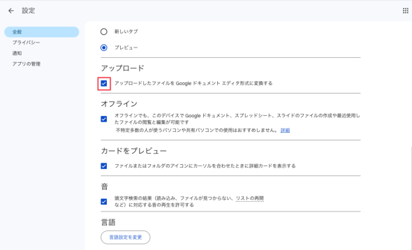 そこで実施したい一工夫が、Google ドライブの設定にある「アップロードしたファイルをGoogle ドキュメント エディタ形式に変換する」の項目だ。これをオンにしておけば、ファイルをアップロードした時点で変換が完了するので、スムーズにNotebookLMに追加できる。