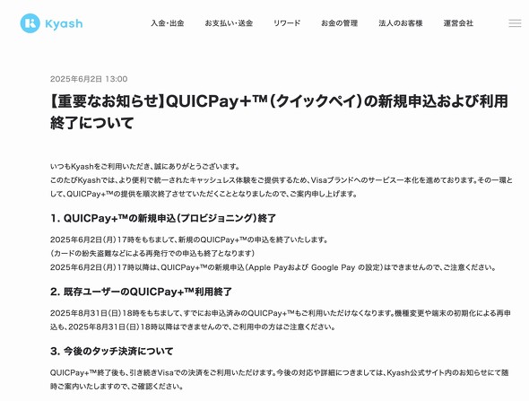 Kyashは2025年6月2日にQUICPay+の新規申込を停止し、8月31日には既存ユーザーの利用も完全終了すると発表。同社は「より便利で統一されたキャッシュレス体験を提供するため、Visaブランドへのサービス一本化を進めている」と説明している