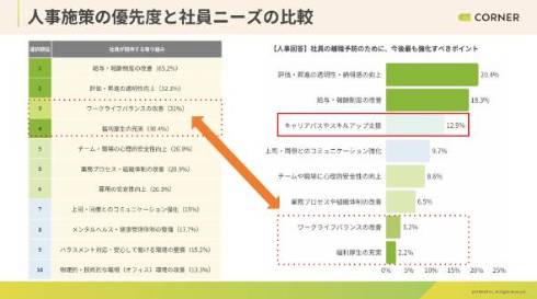 一方で、次に社員ニーズの高い「ワークライフバランスの改善」「福利厚生(手当など)の充実」は企業側の優先度が低い結果に。社員と企業の間に認識ギャップが生じている実態も明らかになった。