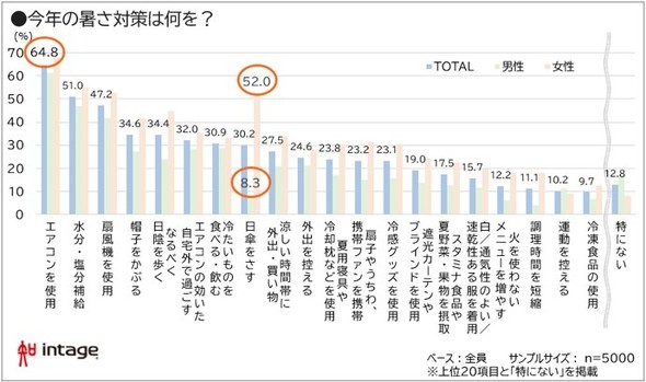 暑さ対策として最も多く挙げられたのは「エアコン(冷房)を使用」(64.8%)で、「水分・塩分補給」(51.0%)、「扇風機を使用」(47.2%)が続いた。また、「涼しい時間帯に外出・買い物」(27.5%)、「火を使わないメニューを増やす」(12.2%)といった行動面での工夫もあった。女性の52.0%は「日傘をさす」と回答した。