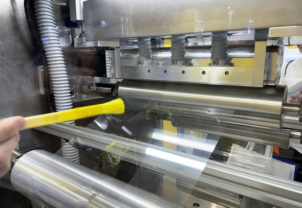 バッテリー内部のセパレーターとなるフィルムを送る装置の中には、異物を除去する機械が組み込まれる。写真は異物に見立てた黄色い粉末をフィルムに振りかけ、それをどのように除去するかデモしている様子(筆者撮影)ならば品質の差はどこで生まれるのか。あるメーカーの説明員は「中国のメーカーは不良品率が10%であれば、100個の製品を送る際に、あらかじめ10個の代替品を追加して納品する」のだという。