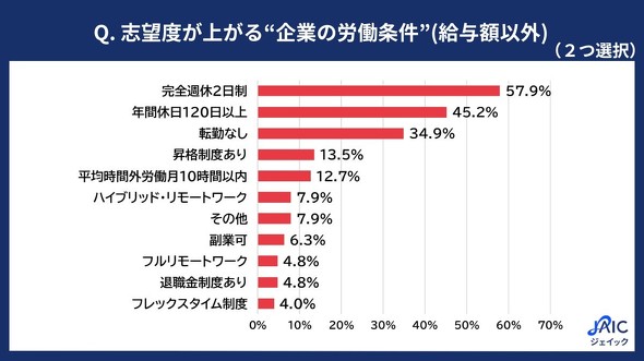 志望度が上がる企業の労働条件として、給与以外では何が重視されているのか。就職支援事業を手掛けるジェイック(東京都千代田区)が20代求職者を対象に調査を実施し、1位は「完全週休2日制」(57.9%)となった。