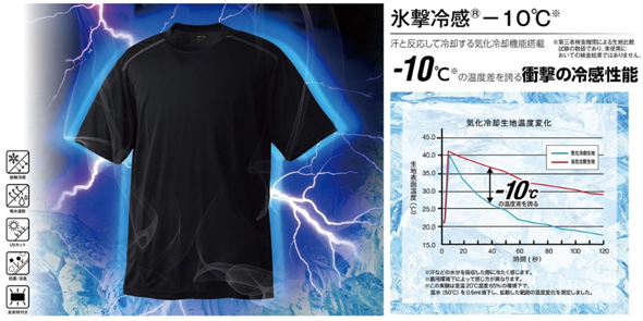 主な機能としては、触った瞬間にひんやりする「接触冷感」のほか、洗濯後に短時間で乾きやすい「吸水速乾」、屋外でうれしい「UVカット」、におい対策としての「抗菌・消臭」、夜間作業時も安心の「反射材付き」機能の5点となる。冷感性能としては、第三者機関の調査でマイナス10度の温度差を実現しているという。