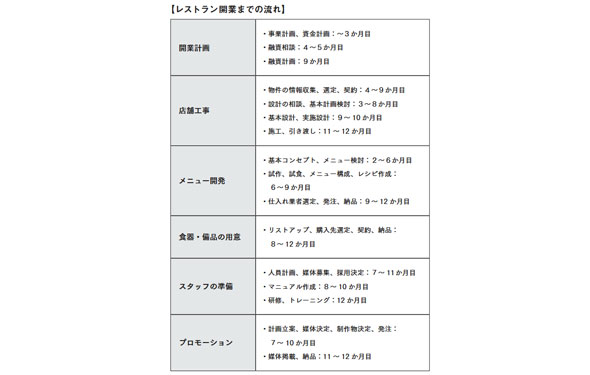 もしも、レストランをオープンするとしたら、作業は大まかに分けて、開業計画、店舗工事、メニュー開発、食器・備品の用意、スタッフの準備、プロモーションに分類されます。標準的なスケジュールでは、1年間かけてオープンする流れになります。