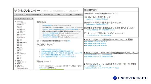 下の画像は、私が以前リクルートに勤めていた際に作成していた、解析ツール用のポータルサイトです。よくある質問や最新の情報、セミナー資料や動画などを用意して500人程度の利用者を支えていました。