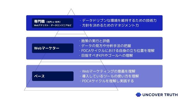 PDCAサイクルはあくまでも仕組みです。仕組みを実行するには人や組織、文化も必要になります。「データを基に判断すること」についての社内理解向上や、体系立てて実行する人員が欠かせません。
