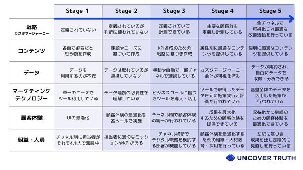 自社の組織をよりデータドリブンな組織にしていくには、まずは自分たちの状態(ステージ)を理解する必要があります。以下は、私がデジタルマーケティングを6つの項目×5つのステージに分けたマップになります。