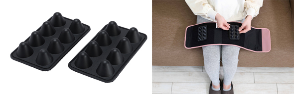 8つの突起が特徴の「ぽこぽこパーツ」を2個付属しており、本機裏面の面ファスナーに同パーツを付け、強力エアバッグと組み合わせることによって、まるでゴリラにつかまれているような“痛きもちイイ”感覚を実現するという。